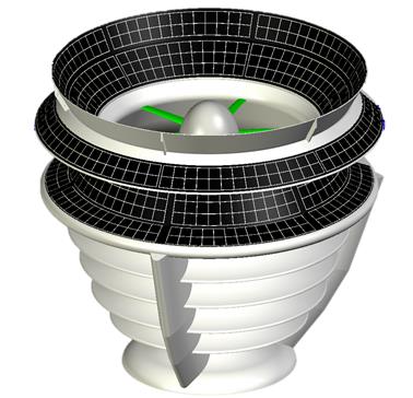 IMPLUX's “fluid dynamic gate effect” and “push-pull” principles are utilised in the new IMPLUX Omni -directional Wind Power Turbine to streamline and accelerate turbulent winds.